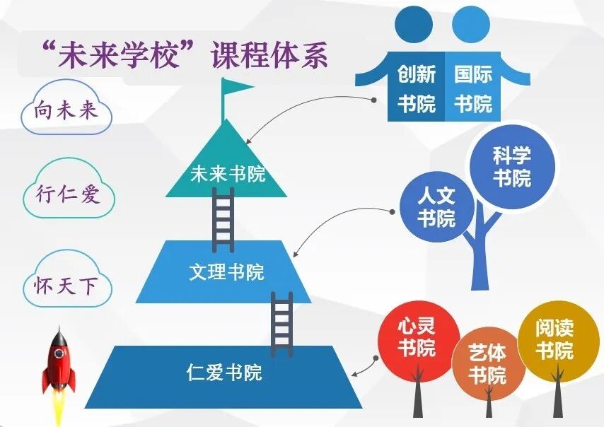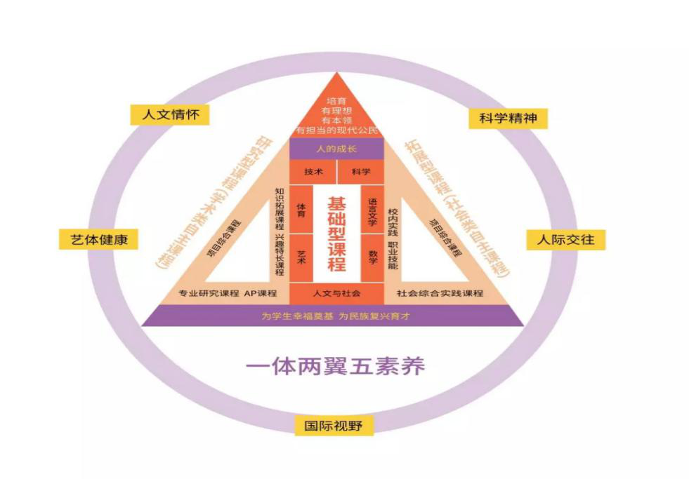 立足学生发展,聚焦核心素养,建构“一体两翼五素养”课程体系,基础型、拓展型、研究型三类课程并重兼顾,长课程、短课程、微课程三种课程并驾齐驱,供学生自主选择学习。着眼培养未来英才,开发“未来学校”书院制课程体系,创办仁爱书院、文理书院、未来书院,建设省级人工智能样本实验室,打造机器人创客实践基地。开展戏剧节、吟诵会、英语周、电影展、研学旅行……丰富多彩的活动,坚持立德树人,落实五育并举,促进学生全面而有个性地成长。