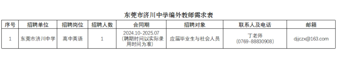 本次共招聘编外教师1人(高中英语),具体招聘岗位详见下表: